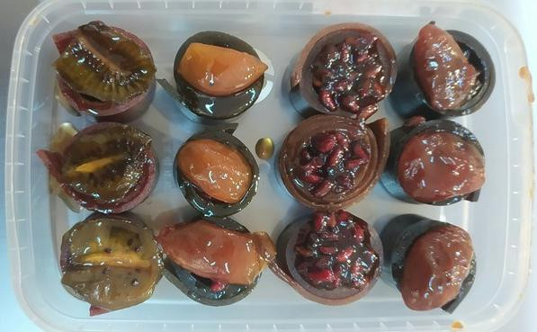 این لواشک ها با ترشک دونه انار ، ترشک قیصی زرد و اسلایس کیوی ترشک قیصی قرمز به صورت سوشی ژاپنی پیچیده شده و در بسته بندی شفاف به همراه سس مخصوص لواشک تقدیم حضورتون میشود.